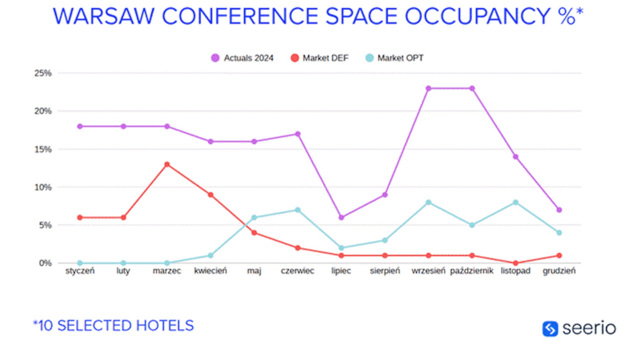 The beginning of summer is a time for summarizing and planning for the next business season. Before the conference season gets back into full swing in the fall, service providers in this industry are preparing their offers. Proposals for organizing holiday events are already available, and new spaces are being put into use, such as the new conference rooms at Leonardo Royal Warsaw. All this is to ensure that from September and October, when interest in events peaks, services of the highest standard can be provided. The chart below, “WARSAW CONFERENCE SPACE OCCUPANCY %,” compiled by Seerio in Q1 2025 from data collected from 10 selected hotels in Warsaw, illustrates not only the discussed increase in conference space occupancy, but also the summer lull in events.