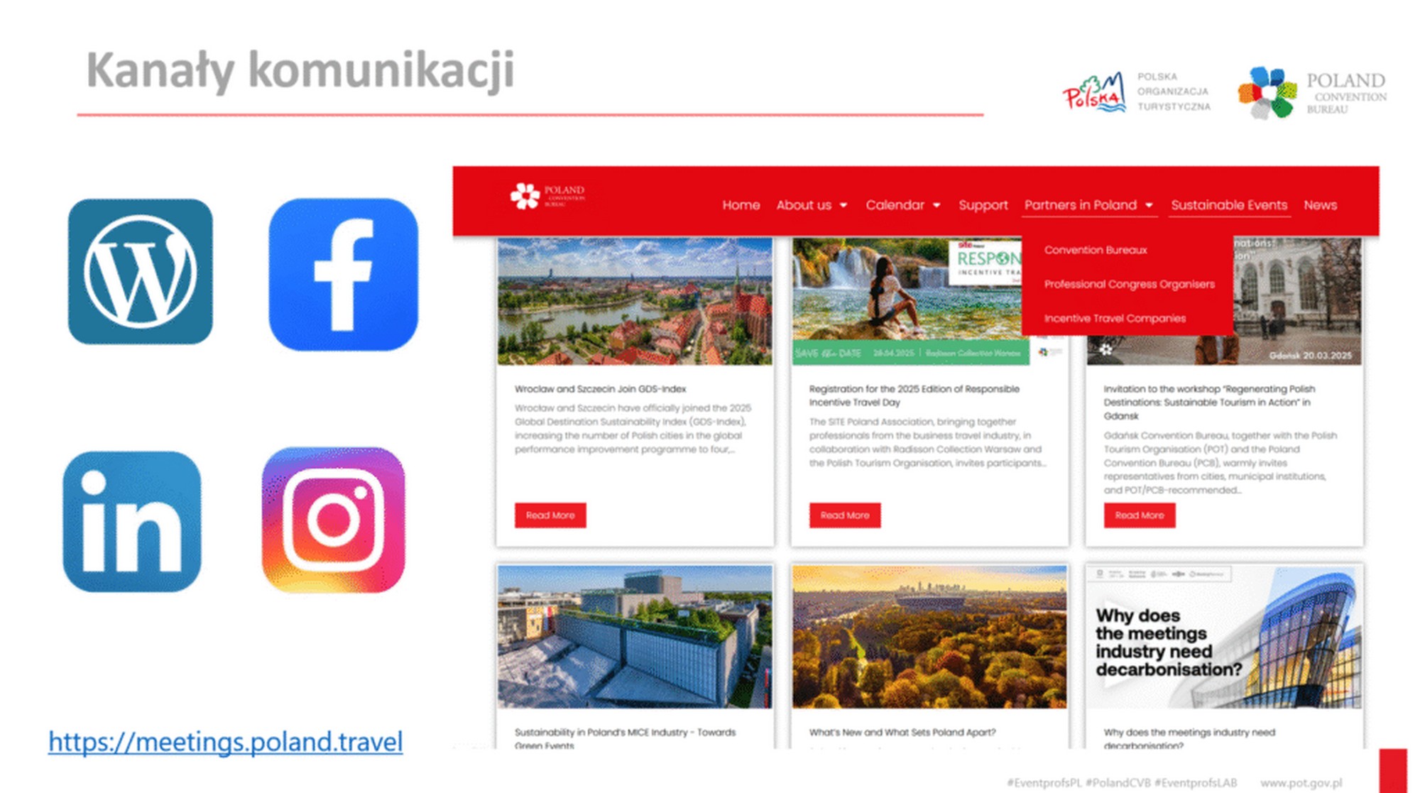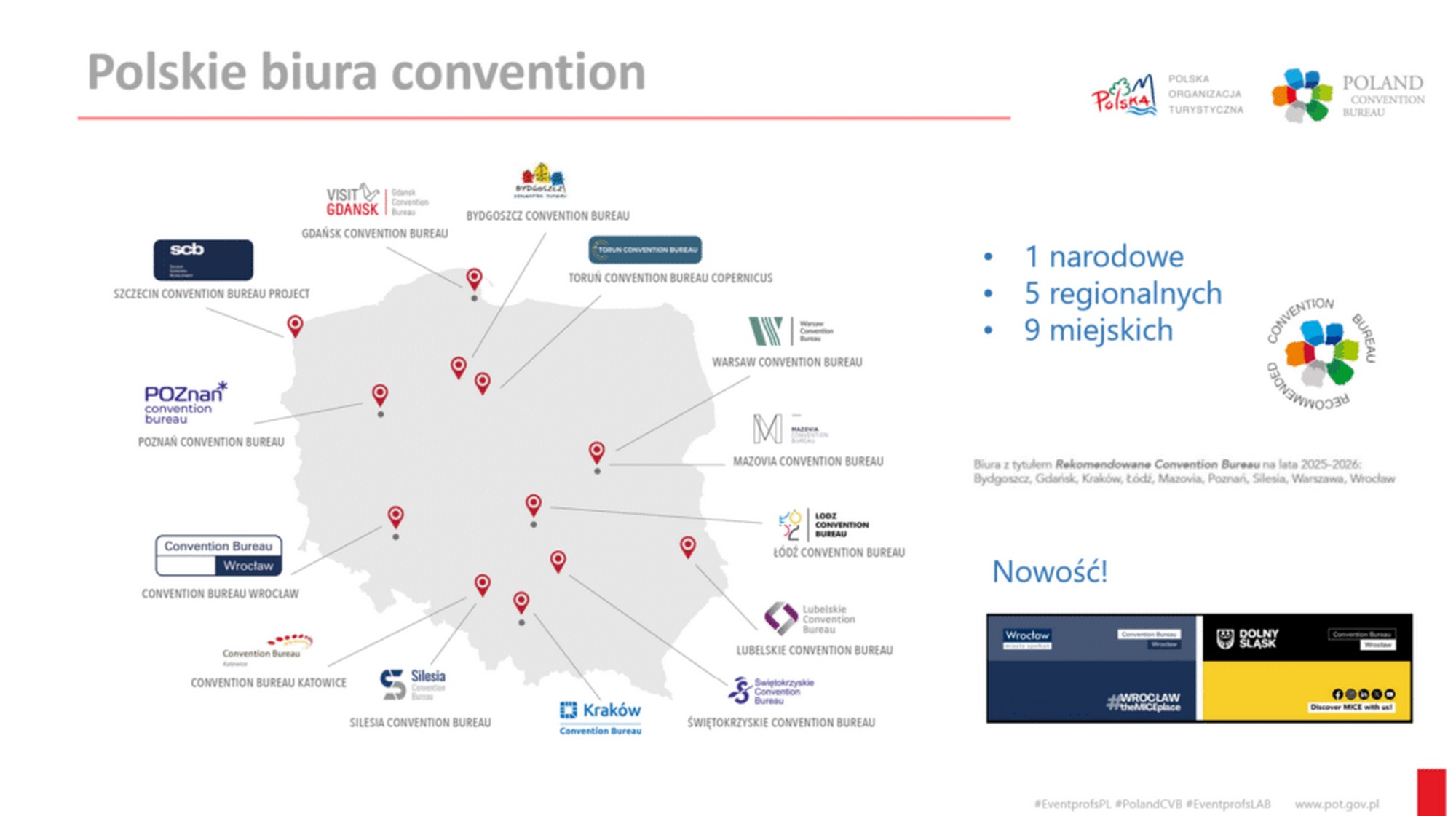 The Poland Convention Bureau (PCB) has been operating within the structures of the Polish Tourist Organization since 2002 as a national convention bureau whose mission is to support the development of the meetings industry and promote Poland as an attractive MICE destination. Over the years, as a result of close cooperation and the growing importance of this sector, a network of local convention bureaus – both regional and municipal – has been established in Poland. Currently, there are several units operating in the largest and medium-sized centers in the country, which together with the PCB form a coherent platform for the promotion and professional service of business events.