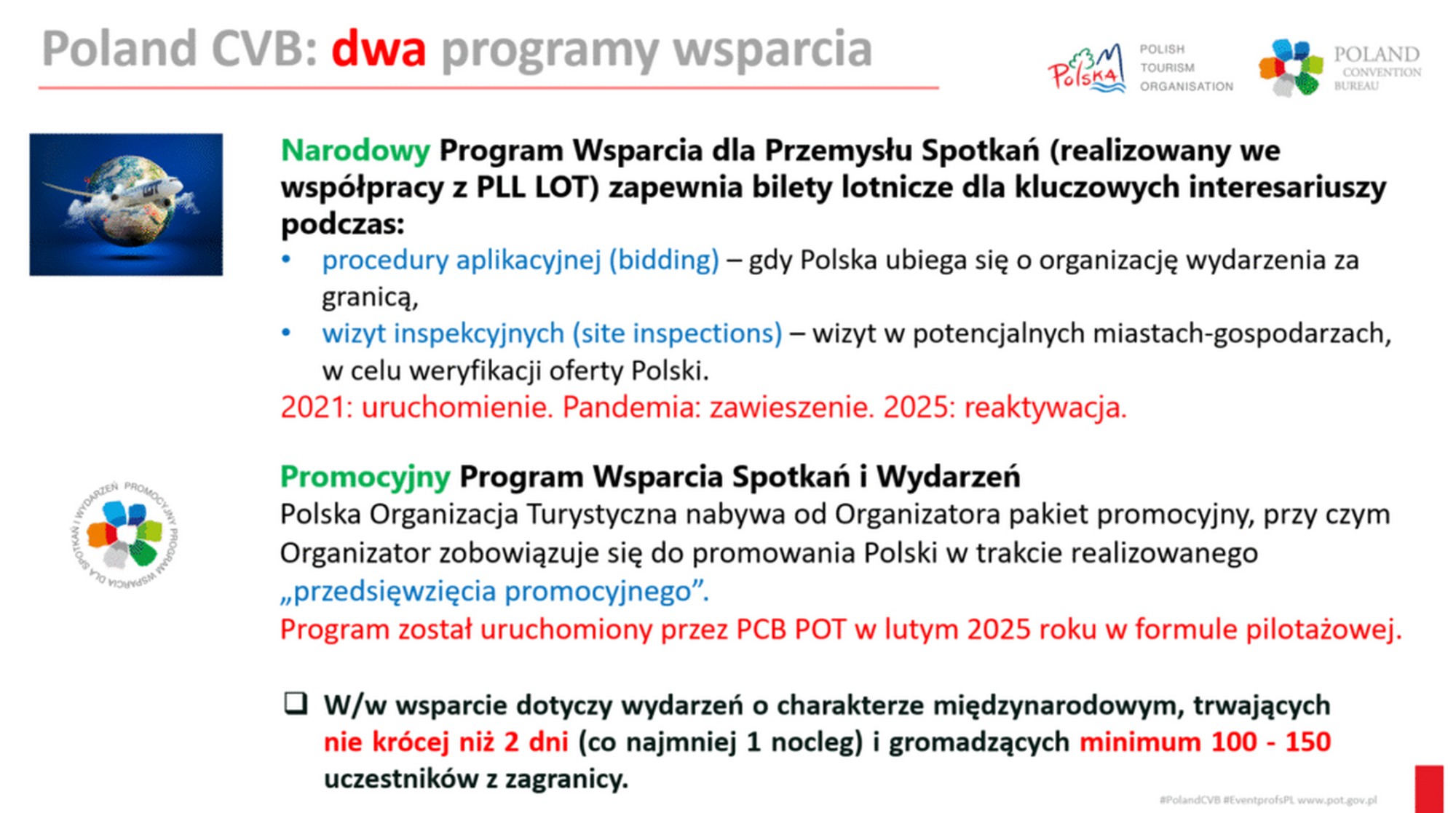 Participants were familiarized with the rules of the Promotional Support Program for Meetings and Events and the reactivated National Support Program for the Meetings Industry, implemented in cooperation with LOT Polish Airlines. The importance of the results achieved so far, including international events, was emphasized.